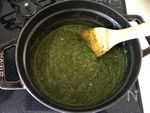 ほうれん草ペーストとヨーグルトを加えてひと煮立ちしたら、D 砂糖 小さじ2、塩 小さじ1/4~ を加えて味を調える。 |
