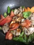 先ずピーマンを入れて炒める。シャキッと感を残して炒めて下さい。 ピーマンが炒まったら、トマトを入れてざっと炒める。 A 焼肉のタレ 大さじ1、コチュジャン 大さじ1、はちみつ 大さじ1、豆板醤 小さじ1、醤油 小さじ1 を入れて、煽って炒め、全体に絡ませる。最後に炒りごまを振る。 |
