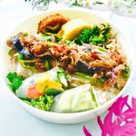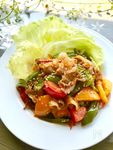 レタスなどを敷いて、盛り付ける。 レタスに、ごはんと一緒に巻いて食べても美味♪ |