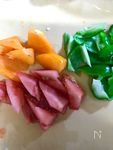 トマトは8等分に切り、さらに半分にカットする。 ピーマンは乱切りにする。 |