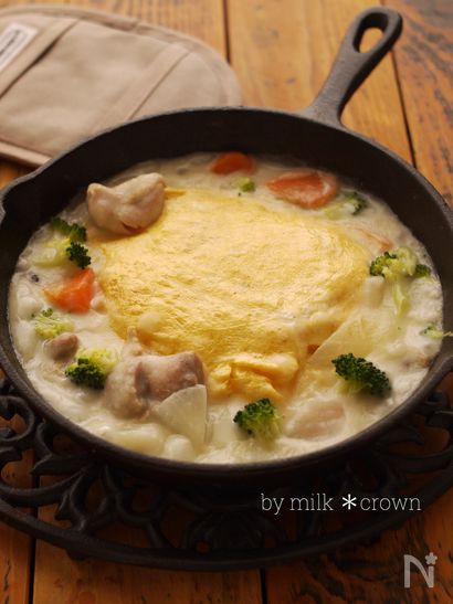 近頃クリームシチューはかけて食べる派が多いらしい(╹◡╹)♡シチューと卵が絶妙コラボ♪卵で巻くと大人も子供も大喜び。中のご飯はもちろんケチャップライスでも美味しいですよ。