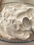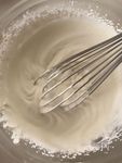 B 生クリーム(動物性) 200cc、グラニュー糖 大さじ1,5 を泡立てます。良く冷えた状態で泡立てます。ゆるめの状態でストップ。 |