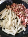 ・フライパンにごま油(大さじ1/2)を入れて中火で熱して、豚こま切れ肉を入れ、片側に寄せてもう片側に大根を入れて別々に炒めます。 | |