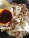 ・豚こま切れ肉の色が変わったら、合わせ調味料を入れて混ぜ、フタをして5分煮ます。 | |