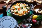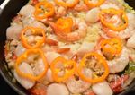 弱火に落として30~35分。途中、煮汁が半量くらいになったら、海老・ホタテを並べ入れる。 ※お米に芯が残らない程度の硬さまでゆっくり火を通す。 オーブン200度に予熱。 オレンジパプリカを輪切りにスライスする。 |