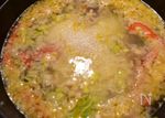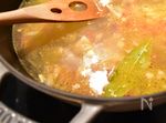 (3)のお肉に火が通ったら、合わせておいたA 水 1000ml、顆粒コンソメ 小さじ2、鶏ガラスープの素 小さじ1、ローリエ 2枚、クミン(あれば) 2振り、パプリカ・粉 5振り を入れ、強めの中火で煮立てる。 |