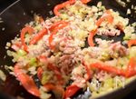 (1)のにんにくの香りがたってきたら、玉ねぎ・長ネギ・赤パプリカ・塩を入れしんなりするまで焦がさないように炒める。 | |