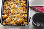 (2)にA 福神漬け 1/2袋、ひよこ豆 100g と合わせておいたB塩 小さじ1/3、ナツメグ・粉 1振り、パプリカパウダー 4振り、コショー(細挽き) 3振り、チリパウダー(あれば) 小さじ1/4、クミンパウダー 小さじ1/3、カレー粉 小さじ2 と中濃ソースを入れ1分炒めます。 |