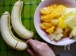 お好みのフルーツやフルーツ缶は、蜜を切って一口大に切ります。バナナは輪切りに。りんごはくし切りにして塩水にさらしキッチンペーパーで水気を拭き、オレンジまたはみかん(缶詰可)は皮を取り除きます。 | |