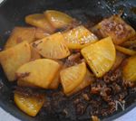 A 酒 大さじ1、水 大さじ2、しょうゆ 大さじ1、ヤンニョムチキンだれ 大さじ3 を合わせて入れて水分が飛ぶまでじっくり炒めながら煮ていきます。(5分強。) |