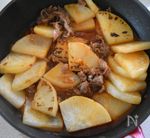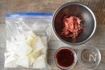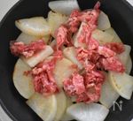 牛切り落とし肉は千切りにして分量外の酒・しょうゆ各大さじ1を合わせておきます。 大根は皮をむいて縦半分に切り1cm厚さに切り、ジプロックに入れて600wのレンジで2分、裏返して1分半加熱します。(計3分半前後。レンジによって異なるので、ご自宅のレンジに合わせて調整してください。全体に透明になっていたらOKのサインです。) |