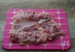 ■鶏モモ肉は、黄色味を帯びた脂と筋や手で触って硬い軟骨などを丁寧に取り除き、全体をフォークや包丁の刃先でついて身の厚いところに切り込みを入れます。 ※鶏肉料理は、下処理をしっかりすることで風味・食感良く仕上がります。 |