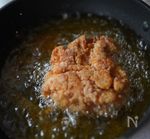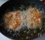 〈 一度揚げ 〉 (2)に(3)を全体にまんべんなく塗し、160度に熱した揚げ油で揚げます。皮面が下になるように入れて2分〜2分半、皮面がさっくりと持ち上げられるようになってから裏返して2分揚げます。 ■油に接している面がサクッとしてから返すと返しやすく、衣もはげません。 |