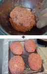玉ねぎ・ふやかしたパン粉・卵・塩胡椒・ナツメグパウダーを加えてさらによく捏ねて3~4分割し、空気を抜きながら俵型に成形する。 ※煮込むので厚くても大丈夫です。 |