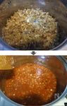 さきほどの鍋で玉ねぎ・セロリ・ニンニクを少ししんなりする程度に炒めたら無塩トマトジュースを注ぐ。 | |