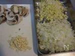 【ガリデミトマトソース】 マッシュルームを厚めにスライスし、玉ねぎ・セロリ・ニンニクはみじん切りにする。 |