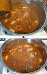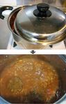 沸騰したらB デミグラスソース缶 1/2缶(150g程度)、パルメザンチーズ 大さじ1/2、味噌 大さじ1/2、醤油 大さじ1/2、塩胡椒 少々 を加えてよく混ぜて溶かし、マッシュルームを加え、ハンバーグを肉汁ごと鍋に戻す。 |