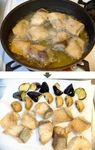 揚げ油を熱し、まずは茄子とマッシュルームを素揚げして取り出す。 ※フライパン揚げの場合の油の量は1㎝ほど。 |