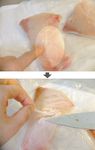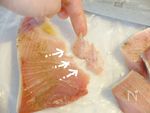 【おまけ:骨取り②】 指で触ってみて少し深めに骨がある場合は、骨に沿って包丁を入れると指でスッと抜き取れます。 |