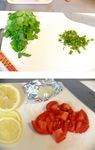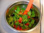 B レモン汁 1/2個分、すりおろしニンニク 1/2片分、蜂蜜 小さじ1、醤油 小さじ1、胡麻油 小さじ1、タバスコ 5振り~調整 を合わせてソースを作り、パクチー・トマトを和えておく。 |