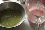 1を120mlとって、いちごをつぶしたものに入れて、泡だて器で混ぜる。 1を120mlとって、B モリンガパウダーまたは青汁パウダー 大さじ1/2、豆乳 大さじ1 に入れて、泡だて器で混ぜる。 |