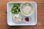 ブロッコリーは細かく小房に分け、絹ごし豆腐は1cmほどの角切り、梅干しは荒く刻む。 | |